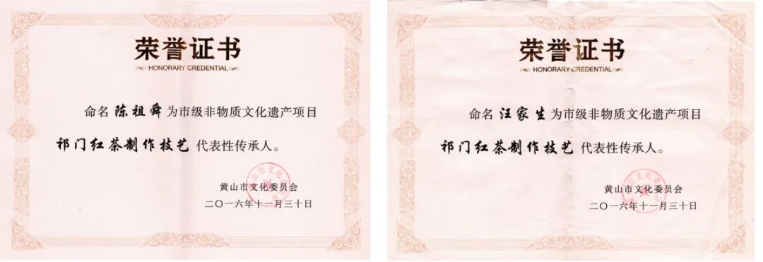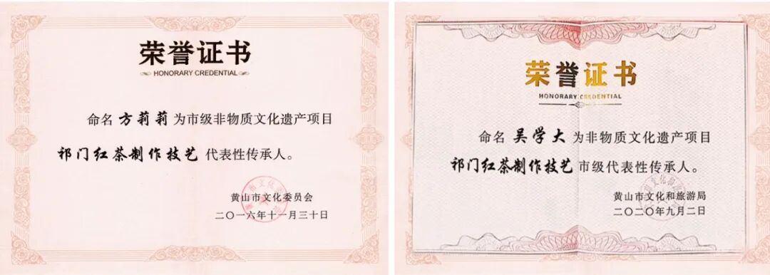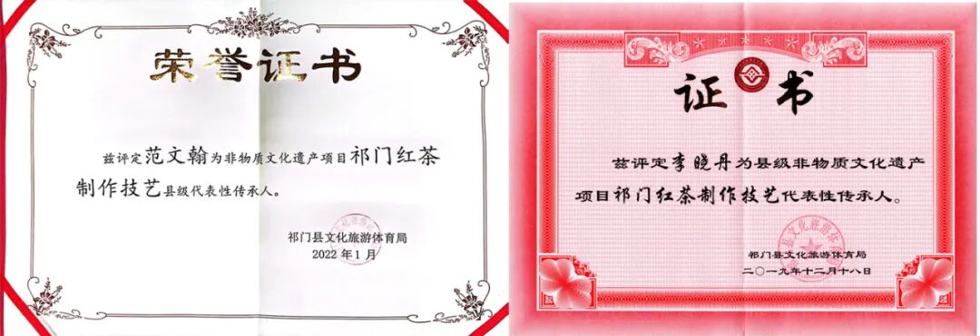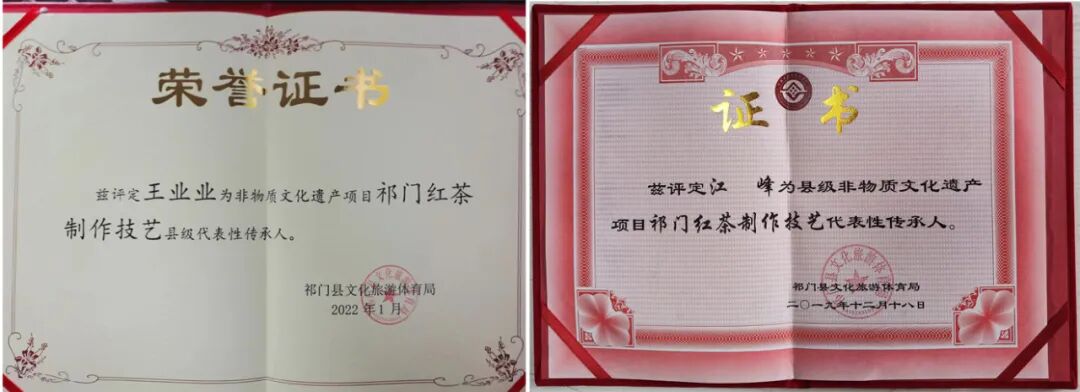 董事长王昶及老茶师们的言传身教,培养了一批批中青年制茶专家和非遗技艺传承人。近年来公司有李晓丹、江峰、王业业、范文翰等4人获评 “县级传承人”,很好地完成了非遗技艺传承的年轻化和知识化,为公司及祁红产业的发展储备了优秀的后备人才。